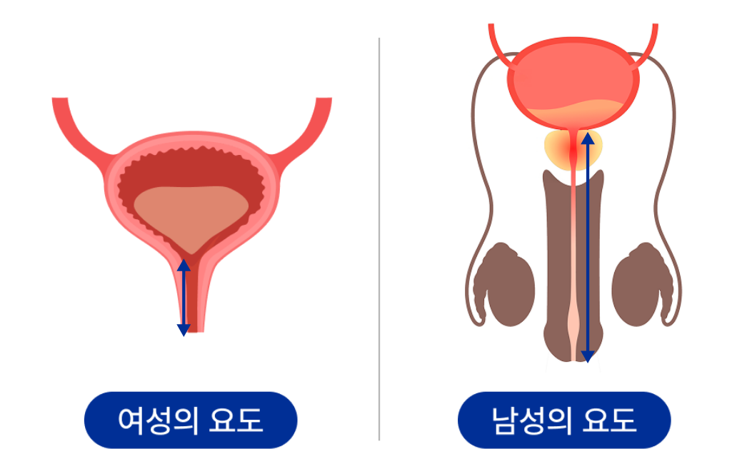 여성의 경우 요도가 짧고 요도 입구가 질과 항문에 가까워 세균이 쉽게 침입할 수 있기 때문입니다.